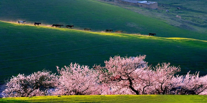 Và mùa xuân từ tháng 3 đến hết tháng 4, khắp vùng bắc Tân Cương rộng lớn hoa anh đào nở rộ khắp các thảo nguyên, thung lũng, núi đồi… hãy thử một lần đến với Tân Cương để cảm nhận sự khác biệt ấy
